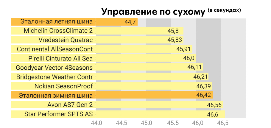 Эталонные зимняя и летняя шины чувствовали себя так, как и следовало ожидать. У зимней модели, как ни странно, просто не хватало сцепления для прохождения сухих кругов, а летняя шина была самой быстрой и автомобиль соответственно вел себя более динамично.