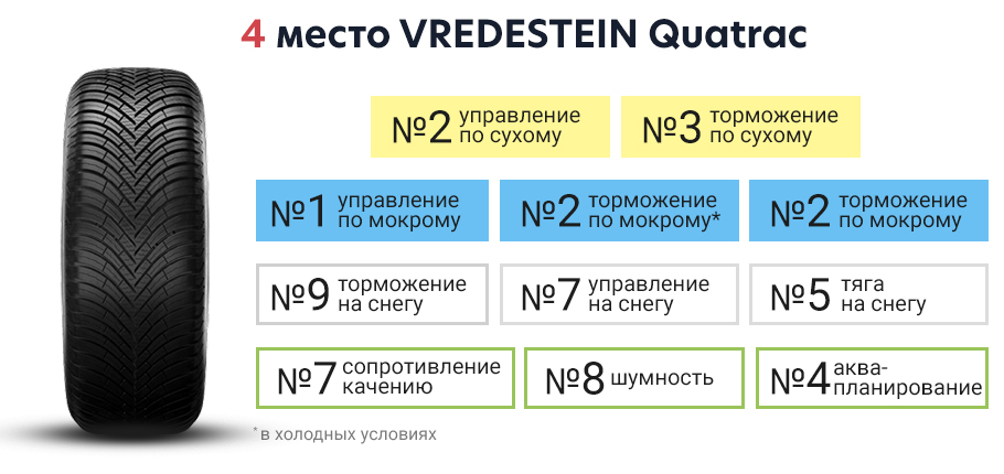 Шина Vredestein Quatrac - профессионал на мокрой и сухой дороге, которая очень хорошо справляется со всеми тестами сцепления. К сожалению, характеристики шины на снегу были недостаточными по сравнению с лучшими, но это все равно очень хорошая всесезонная шина для более мягкого климата.
