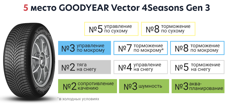 Модель Goodyear Vector 4Seasons Gen-3 была шиной со смешанными результатами. Она хорошо показала себя почти во всех испытаниях, однако имела необычайно длинный тормозной путь на сухом и мокром покрытиях, за что модель смогла занять только пятую позицию в тесте.