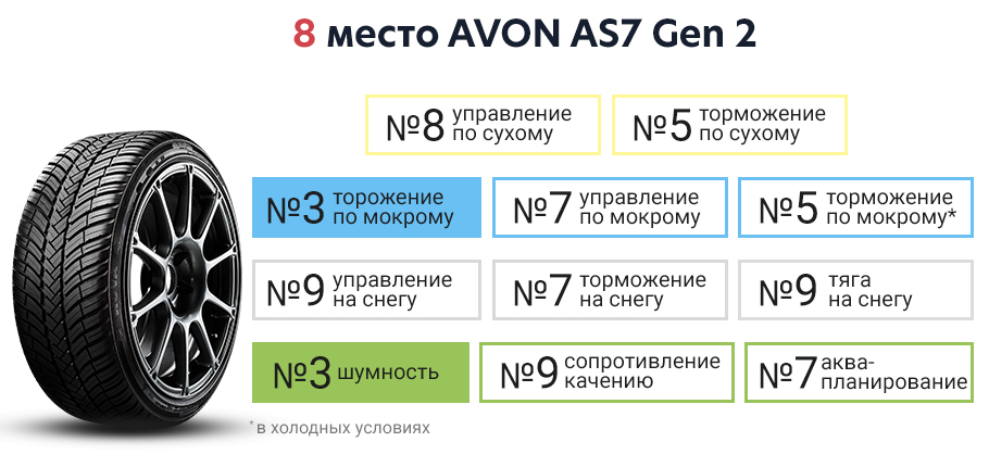 Avon AS7 Gen-2 значительно опережает другие бюджетные шины и обладает хорошим сцеплением на мокрой дороге, но у нее были плохие показатели в каждом снежном тесте, что делает эту модель подходящей для более мягкого зимнего климата.