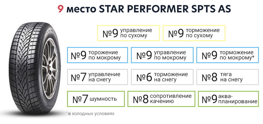 Тест проводился на австрийском полигоне «Вахауринг» при температуре воздуха 2-4 градуса. Худшей в испытании по сухому была «звездная» Star-Performer SPTS A, которая хоть и не была ужасной в плане комфорта и не приносила неприятных сюрпризов, зато ей не хватало сцепления практически постоянно, особенно на больших скоростях.