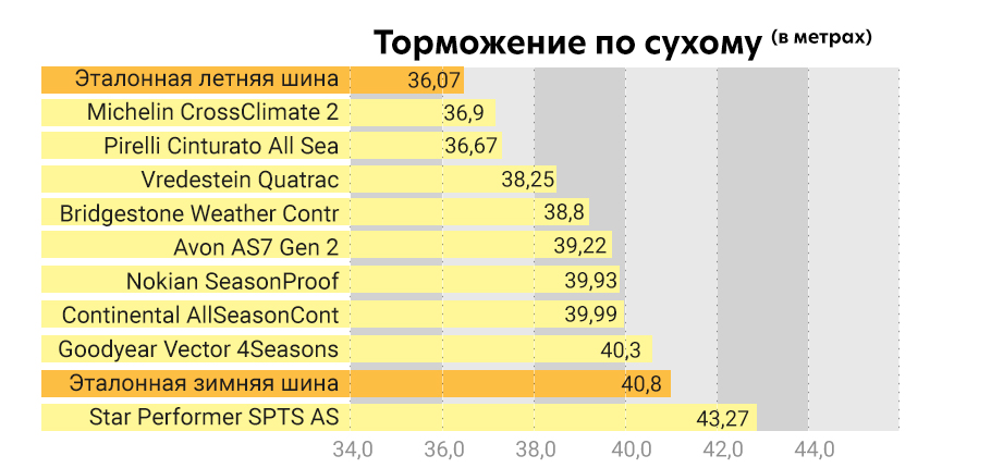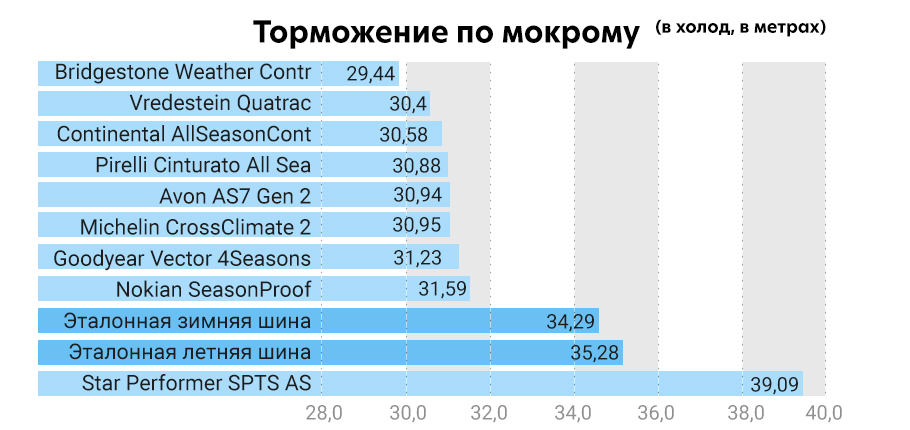 • Самый короткий тормозной путь на мокром покрытии при теплой температуре