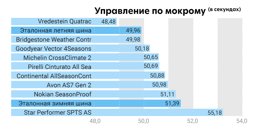Испытание торможения по мокрому проводилось при разных температурах: при 4 градусах и при 15 градусах на полигоне Nokian в Финляндии. Самый большой разрыв в качестве торможения оказался у летней шины, которая в холодных условиях была на предпоследнем месте, а в теплых – на первом. Вот как температура влияет на сцепление!