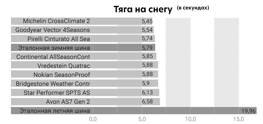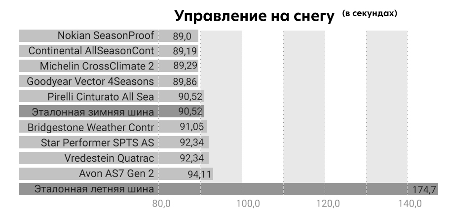 Поразительно, но летняя шина оказалась практически непригодной для езды по снегу, которая почти не позволяла машине двигаться, и поэтому круг на летней резине занял вдвое больше времени, чем у остальных моделей.