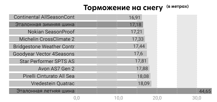 В безопасности критического торможения на снегу лидером стала шина Continental, затем Nokian и на третьем месте оказалась Michelin. Последние позиции заняли прошлые аутсайдеры испытания все те же Star Performer, Avon и Vredestein.